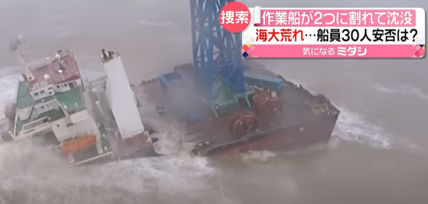 船体が真っ二つに割れ、海に沈みそうになっている船。現地メディアによると2日午前4時前、中国・広東省の沖合で乗組員30人を乗せた洋上風力発電関連の作業船が遭難した。現場付近の風速は時速140キロ以上、10メートルのうねりがあり、昼頃までに3人が救助されたが、残りの27人は海に落ちて行方不明になっている。
